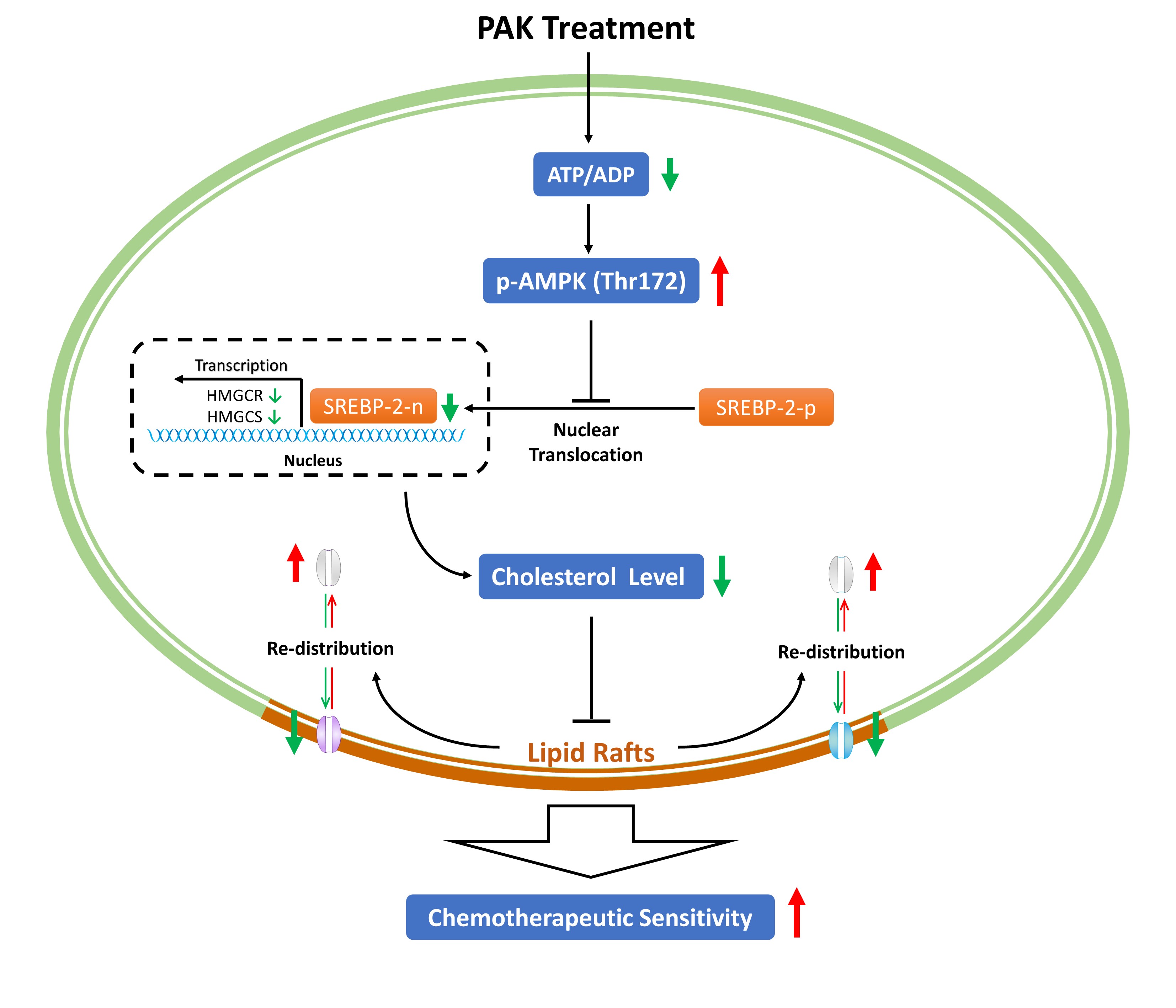 其次,本研究為克服腫瘤多藥耐藥提供了新的研究思路。耐藥癌細(xì)胞相比敏感癌細(xì)胞更少依賴糖酵解途徑獲得能量,而主要依賴線粒體氧化磷酸化(OxPhos)來維持較高的ATP水平。我們發(fā)現(xiàn)PAK不僅能夠抑制線粒體OxPhos降低ATP水平,還能改變ABC轉(zhuǎn)運(yùn)體在脂筏上的定位。這一發(fā)現(xiàn)揭示了一種耐藥逆轉(zhuǎn)模式,即通過藥物破壞脂筏,降低ABC轉(zhuǎn)運(yùn)體在細(xì)胞膜上的分布,從而增強(qiáng)耐藥細(xì)胞對(duì)化療的敏感性。