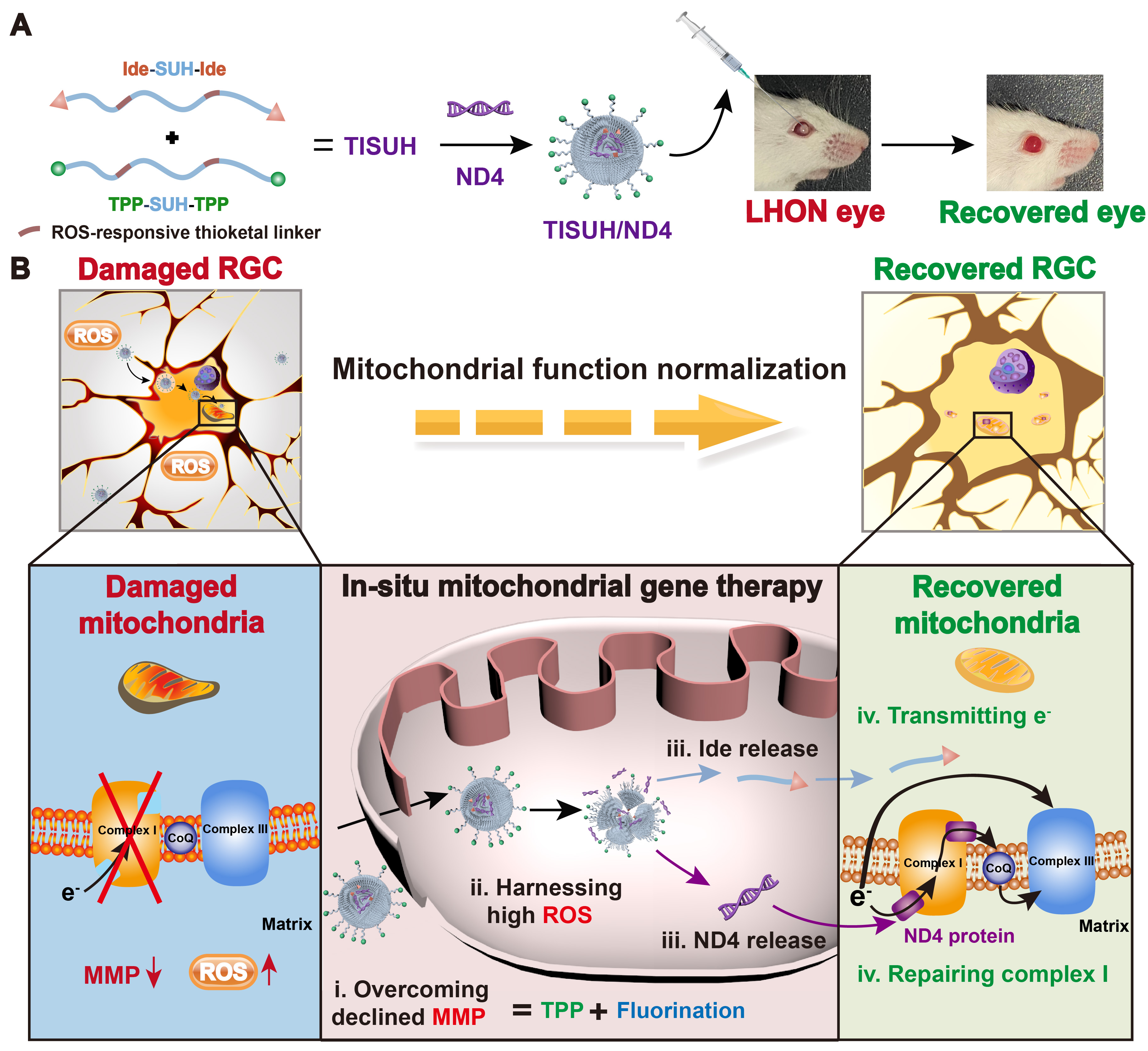 Leber遺傳性視神經(jīng)病變(Leber’s hereditary optic neuropathy,LHON)是一種由線粒體基因(Mitochondrial DNA,mtDNA)突變所導致的遺傳性眼部罕見病。目前唯一批準(歐洲藥品管理局)用于LHON治療的小分子藥物艾地苯醌(Idebenone,Ide)僅能繞過受損的線粒體復合物I直接進行電子傳遞從而緩解線粒體呼吸鏈的負擔,但該藥物并不能從根本上解決mtDNA突變所導致的問題。因此,LHON仍然是一種無法治愈且十分棘手的罕見病。基因治療通過將外源正常基因?qū)氚屑毎约m正或補償缺陷和異常基因引起的疾病,這無疑是 LHON等單基因罕見病的最佳治療手段。雖然在LHON基因治療中,病毒介導的異位表達已取得一定的進展,但是如何實現(xiàn)“一步到位,直擊要害”的原位線粒體基因治療仍然是該領(lǐng)域一個巨大的挑戰(zhàn)。同時,在LHON發(fā)生發(fā)展過程中,上升的活性氧自由基(Reactive oxygen species, ROS)和下降的線粒體膜電位(Mitochondrial membrane potential,MMP)等嚴峻的病理微環(huán)境使得LHON的治療變得更加困難。