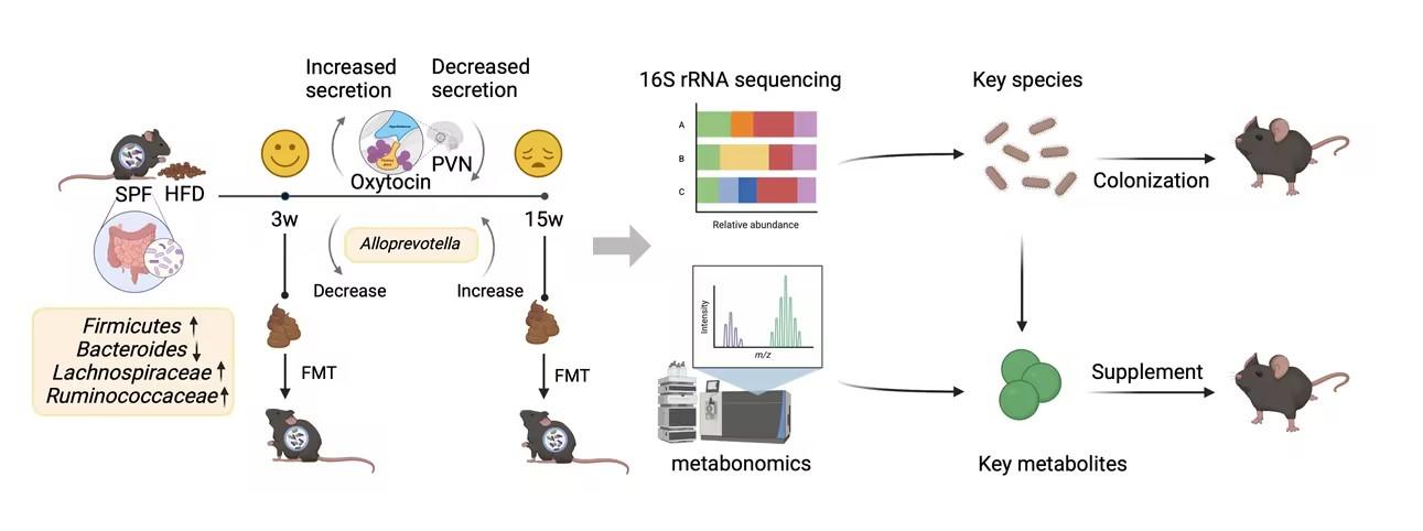 飲食模式在基礎(chǔ)研究和臨床試驗中均被證明與個體身心健康緊密聯(lián)系。長期暴露在高脂飲等西方飲食模式下的小鼠易于產(chǎn)生抑郁、焦慮等行為異常,但其具體機(jī)制仍然未知。本論文研究發(fā)現(xiàn),高脂飲食在短期和長期存在雙向調(diào)控抑郁、焦慮和社交行為的現(xiàn)象。在短期內(nèi)(3周),高脂飲食對反復(fù)社交失敗(Repeated social defeat, RSD)應(yīng)激誘導(dǎo)的抑郁樣行為有保護(hù)作用,而在長期(15周)高脂飲食后則出現(xiàn)加重作用。機(jī)制研究發(fā)現(xiàn)腸道菌群被高脂飲食改變,與RSD應(yīng)激下小鼠的焦慮、抑郁和社交躲避行為存在因果關(guān)聯(lián)。擬普雷沃氏菌屬(Alloprevotella)豐度在短期高脂飲食后減少,而在長期高脂飲食下富集。代謝組學(xué)動態(tài)分析表明結(jié)腸、回腸、盲腸、血清、海馬、前額葉皮層和下丘腦中膽汁酸譜的改變可能與小鼠社交行為及Alloprevotella菌豐度有關(guān)。以上結(jié)果表明短期和長期高脂飲食可能通過影響腸道Alloprevotella菌及腸腦軸膽汁酸代謝而對小鼠社交應(yīng)激敏感性產(chǎn)生雙向調(diào)控,為深入認(rèn)知飲食因素影響抑郁癥風(fēng)險的機(jī)制和干預(yù)策略提供了新發(fā)現(xiàn)。