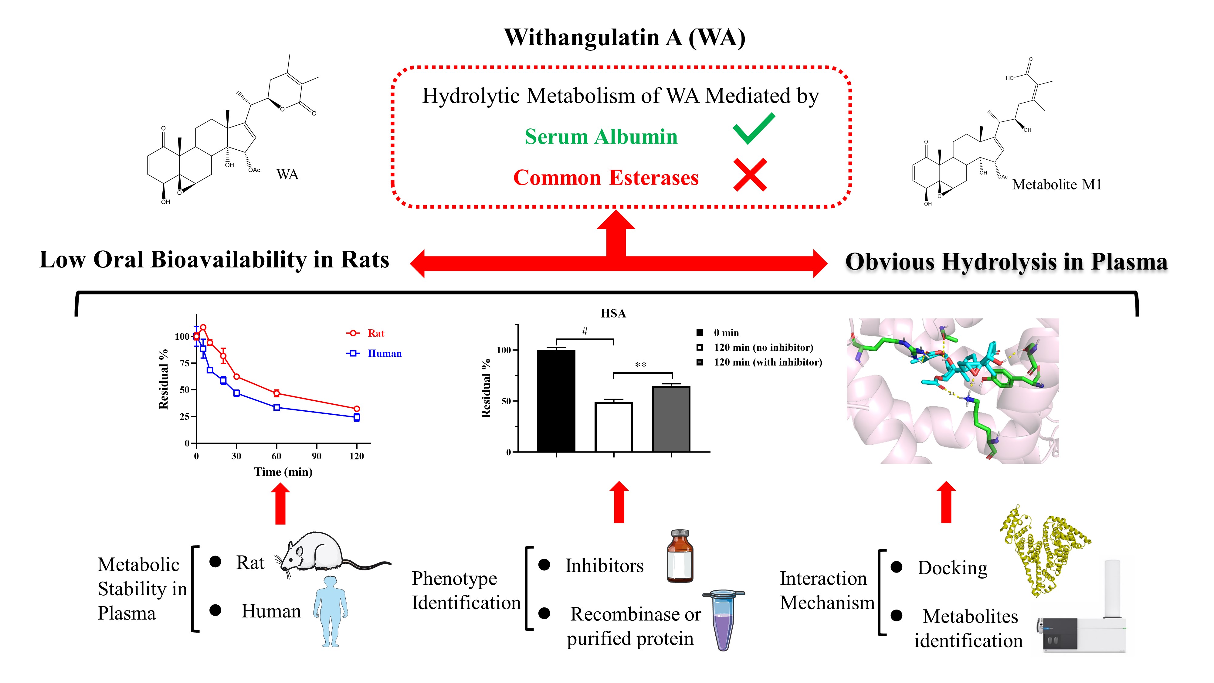 探究過(guò)程:首先探究了WA 在大鼠體內(nèi)的ADME特征及口服生物利用度;通過(guò)系列插管手術(shù)實(shí)現(xiàn)不同部位的給藥和采樣,考察腸道和肝臟對(duì)WA 首過(guò)效應(yīng)的貢獻(xiàn)程度;建立Caco-2細(xì)胞模型,評(píng)價(jià)WA滲透能力與跨膜轉(zhuǎn)運(yùn)機(jī)制;采用不同體外代謝體系,探究WA的主要代謝部位、代謝反應(yīng)類(lèi)型,以及鑒定介導(dǎo)WA代謝的CYP450s /水解酶亞型;通過(guò)酶動(dòng)力學(xué)分析、分子對(duì)接、蛋白結(jié)合率等試驗(yàn)探究WA與白蛋白的相互作用,完善WA的水解代謝行為和機(jī)制。