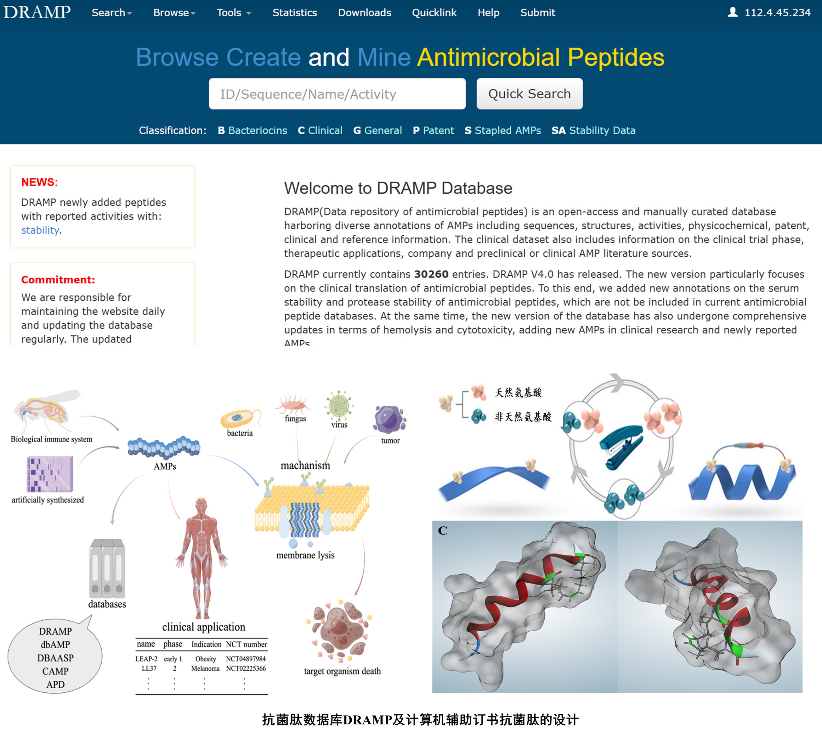 課題組成功開發(fā)并更新了抗菌肽數(shù)據(jù)庫DRAMP的3.0版本,相關(guān)論文發(fā)表在數(shù)據(jù)庫領(lǐng)域的頂尖期刊Nucleic Acids Research上。作為一個手動注釋的開放獲取數(shù)據(jù)庫,DRAMP 3.0新增了2360條記錄,使總條目達(dá)到了22259條。這些條目包括5891條普通條目、16110條專利條目、77條臨床條目以及181條新型環(huán)化抗菌肽條目。首次系統(tǒng)性地收集和組織了環(huán)化抗菌肽(stapled AMPs)的信息。這類肽通過化學(xué)修飾形成環(huán)狀結(jié)構(gòu),具有良好的抗菌活性和結(jié)構(gòu)穩(wěn)定性。為了幫助設(shè)計低毒性的抗菌肽,我們還新增了細(xì)胞毒性數(shù)據(jù)。此外,數(shù)據(jù)庫還包含263個預(yù)測結(jié)構(gòu)和300多個鏈接到蛋白質(zhì)數(shù)據(jù)庫(PDB)的實驗結(jié)構(gòu)。對于數(shù)據(jù)庫的更新還包括提供了新的分類系統(tǒng),增加了細(xì)胞毒性、化學(xué)修飾、鏈間鍵、手性等新的注釋字段等。促使DRAMP成為國內(nèi)外最重要的抗菌肽數(shù)據(jù)庫之一,在全球生物學(xué)數(shù)據(jù)庫中位列前5%。