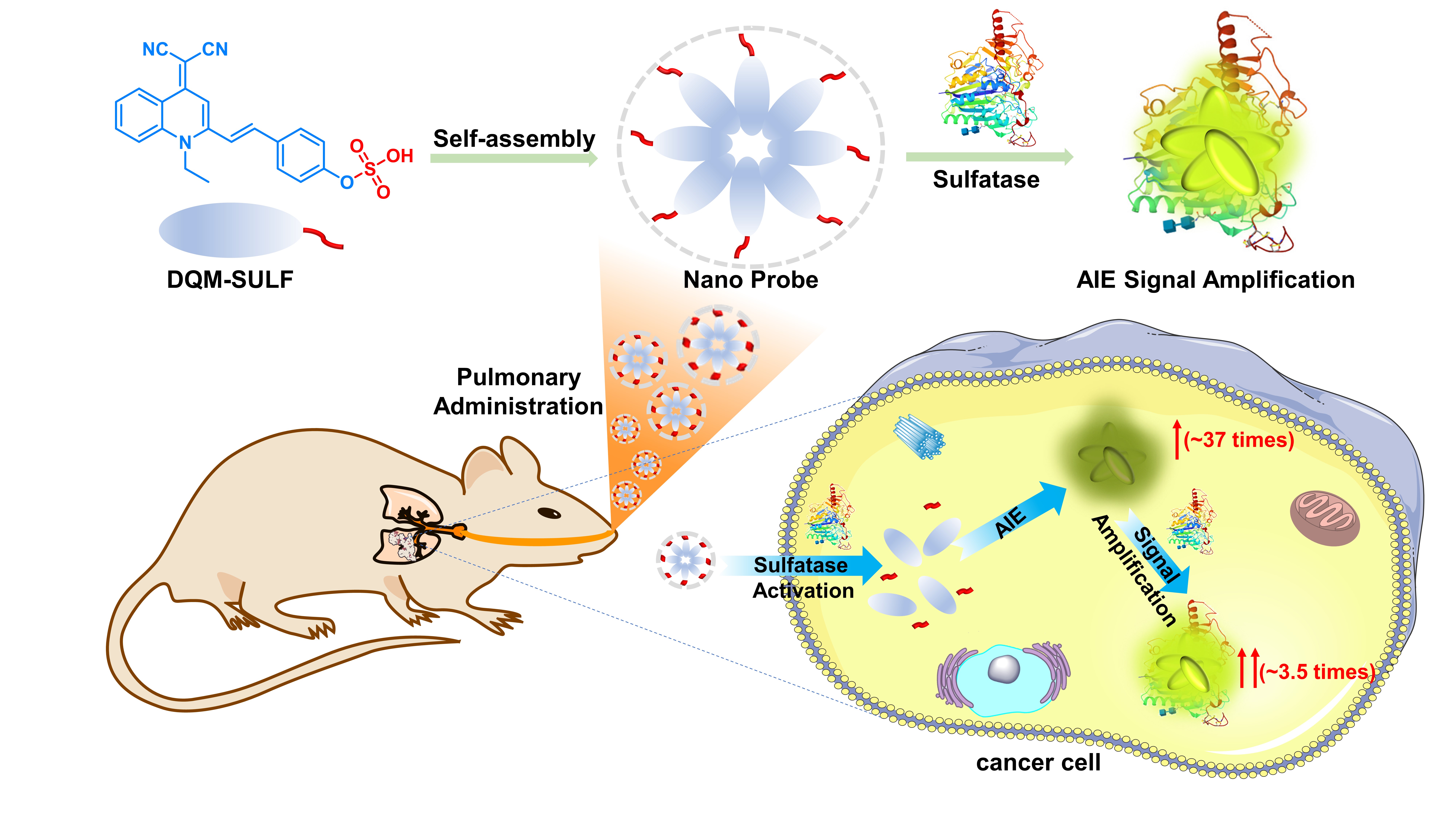 癌癥的早期準(zhǔn)確診斷對(duì)于提高癌癥存活率和增加治愈機(jī)會(huì)具有重要意義。硫酸酯酶作為潛在的腫瘤標(biāo)志物,參與細(xì)胞信號(hào)調(diào)節(jié)、激素合成等生物學(xué)過(guò)程,與惡性腫瘤的發(fā)生和發(fā)展都密切相關(guān),并在多種癌癥中均異常表達(dá)。本研究基于AIE熒光團(tuán)喹啉-丙二腈設(shè)計(jì)合成了用于體內(nèi)外檢測(cè)硫酸酯酶的熒光探針DQM-SULF。探針DQM-SULF以疏水性DQM衍生物為核心,以親水性硫酸酯鍵為硫酸酯酶的識(shí)別單元。由于兩親性的結(jié)構(gòu),探針可以在水溶液中自組裝形成納米顆粒。納米探針DQM-SULF在硫酸酯酶的作用下被水解成熒光團(tuán)DQM-OH,DQM-OH因其溶解性和極性變化而發(fā)出AIE熒光。此外,AIE熒光團(tuán)DQM-OH還可以與硫酸酯酶的疏水空腔結(jié)合,通過(guò)疏水性相互作用使熒光團(tuán)的熒光發(fā)生二次信號(hào)增強(qiáng)。DQM-SULF被成功地應(yīng)用于檢測(cè)癌細(xì)胞中過(guò)表達(dá)的硫酸酯酶,并且可區(qū)分正常細(xì)胞與癌細(xì)胞。重要的是,該納米探針成功地通過(guò)吸入式肺部給藥,實(shí)現(xiàn)了對(duì)轉(zhuǎn)移性肺腫瘤模型中的硫酸酯酶活性的體內(nèi)成像,表明納米探針DQM-SULF具有作為吸入式造影劑檢測(cè)癌細(xì)胞的潛力。