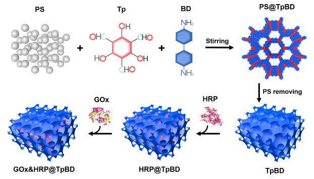 感謝研究生院的精心組織!感謝楊孝蓮?fù)瑢W(xué)為此論文工作付出的努力和汗水!感謝王琛老師的悉心指導(dǎo)與大力幫助!本論文選擇葡萄糖氧化酶(GOx)和辣根過氧化物酶(HRP)作為級聯(lián)酶的組成,以介孔聚合物納米微球為固定化載體,籍其表面改性和表面原位封裝技術(shù)的研究,來探究其在固定化酶后對酶活性和穩(wěn)定性的影響。在后續(xù)的研究中,基于介孔聚合物納米微球(Ps),通過接枝3-氨丙基三乙氧基硅烷(APTES)對Ps進行改性(Aps)以增加其表面的氨基數(shù)量。改性后的APs仍保留了原有的介孔結(jié)構(gòu),級聯(lián)酶既通過靜電吸附固定在介孔內(nèi),又借助1-乙基-3-(3-二甲氨基丙基)碳二亞胺鹽酸鹽和N-羥基琥珀酰亞胺(EDC/NHS)的活化而共價固定在APs表面。另外,通過靜電吸附將酶固定在介孔聚合物納米微球表面,在其表面原位封裝COFs殼,構(gòu)建核-殼型固定化酶體系(GOx&HRP@TpBD/Ps),保持了固定化酶分子的高生物催化活性,此外,我們還嘗試了所構(gòu)建的兩種新型固定化酶體系在細胞內(nèi)葡萄糖檢測的應(yīng)用。目前,擬在固定化酶的表面封裝紅細胞膜并表面修飾透明質(zhì)酸,探究pH響應(yīng)型級聯(lián)酶納米藥物遞送系統(tǒng)的制備及其在腫瘤饑餓治療中的應(yīng)用。