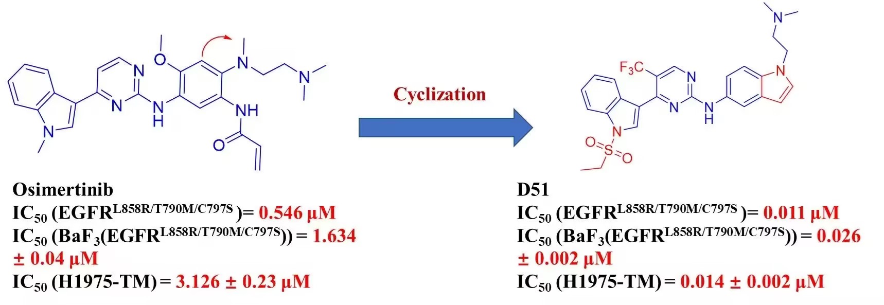 該課題從解決臨床耐藥的角度出發(fā),以奧希替尼為先導(dǎo),基于奧希替尼與EGFR的共晶結(jié)構(gòu),提出通過環(huán)化策略增加化合物與突變蛋白之間的相互作用,成功設(shè)計并合成一系列化合物。并在后續(xù)活性測試中展現(xiàn)了顯著的體內(nèi)與體外的抑制活性。同時,最優(yōu)化合物在藥物代謝動力學(xué)研究中展現(xiàn)了很好的成藥性與安全性。該項研究提供了強效的第四代EGFR抑制劑,并為治療奧希替尼耐藥的非小細胞肺癌治療提供了潛在的候選化合物。