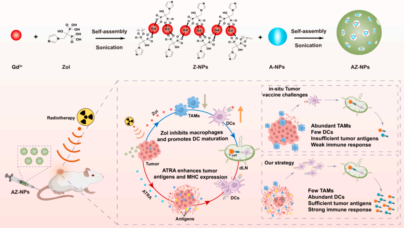 放療可以釋放個(gè)性化的原位腫瘤疫苗,從而增強(qiáng)適應(yīng)性免疫反應(yīng)。然而,由于腫瘤細(xì)胞的免疫原性較低和免疫抑制微環(huán)境,這些疫苗不能有效地呈現(xiàn)并激活免疫系統(tǒng)。在我們的研究中,我們創(chuàng)新設(shè)計(jì)了使用全反式維甲酸(ATRA)和唑來(lái)膦酸(Zol)的自組裝納米顆粒(AZ-NPs),以增強(qiáng)放療誘導(dǎo)的原位腫瘤疫苗的免疫應(yīng)答。在AZ-NPs中,ATRA可以通過(guò)放療增加腫瘤抗原和MHC-I分子的表達(dá),釋放更多的腫瘤抗原,而Zol可以消除免疫抑制的腫瘤相關(guān)巨噬細(xì)胞,從而增強(qiáng)樹突狀細(xì)胞的原位腫瘤疫苗呈遞。通過(guò)AZ-NPs和放療的結(jié)合,實(shí)現(xiàn)了強(qiáng)大的協(xié)同抗腫瘤免疫反應(yīng),包括成熟樹突狀細(xì)胞、CD8+ T細(xì)胞和記憶T細(xì)胞的顯著增加。更重要的是,這種聯(lián)合策略可以誘導(dǎo)長(zhǎng)期免疫記憶來(lái)抑制腫瘤的復(fù)發(fā)和轉(zhuǎn)移。總之,我們的研究結(jié)果為激活該系統(tǒng)提供了一個(gè)可行的策略,且在我們的研究中顯示出良好的安全性,該策略可迅速轉(zhuǎn)化為一種新的臨床患者免疫療法。