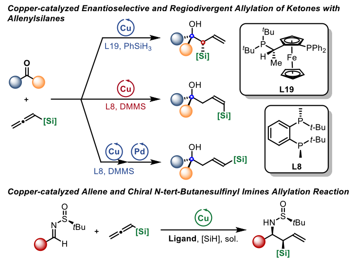 構(gòu)建了一種溫和高效的銅催化反應(yīng)體系,以酮與聯(lián)烯為原料,不同手性配體調(diào)控作用下,高效構(gòu)建手性支鏈高烯丙基叔醇和直鏈Z-式高烯丙基叔醇類化合物;