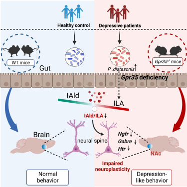 抑郁癥是一種常見(jiàn)的威脅人類身心健康的精神疾病。目前針對(duì)抑郁癥核心癥狀的藥物治療手段具有較大局限性,越來(lái)越多的證據(jù)特別是來(lái)自臨床抑郁癥患者的研究結(jié)果表明腸道菌群紊亂與抑郁癥發(fā)生發(fā)展之間存在功能聯(lián)系,但是其中的關(guān)鍵機(jī)制尚未完全闡明。G蛋白偶聯(lián)受體35(GPR35)在腸組織和免疫系統(tǒng)中高度表達(dá),對(duì)于維持腸道穩(wěn)態(tài)發(fā)揮重要作用。然而,GPR35在腸道菌群-宿主互作及抑郁癥發(fā)生發(fā)展中的作用與機(jī)制尚不明確。為此,本論文首先對(duì)Gpr35基因敲除(Gpr35-/-)小鼠進(jìn)行行為學(xué)評(píng)價(jià)及生化指標(biāo)表征,發(fā)現(xiàn)Gpr35影響抑郁樣行為的潛在作用環(huán)節(jié);進(jìn)一步對(duì)Gpr35-/-小鼠與對(duì)照小鼠在腸道環(huán)境方面的差異進(jìn)行比較分析,發(fā)現(xiàn)兩組小鼠的菌群存在明顯差異且參與到Gpr35-/-小鼠自發(fā)抑郁樣行為的產(chǎn)生;進(jìn)而基于菌群空間傳遞變化規(guī)律及單菌定植實(shí)驗(yàn)分析并驗(yàn)證了Parabacteroides distasonis對(duì)抑郁易感性的調(diào)控作用;最后,基于代謝組學(xué)分析結(jié)合臨床抑郁患者樣本驗(yàn)證,發(fā)現(xiàn)色氨酸的細(xì)菌代謝物吲哚-3-甲醛(IAld)可能是基因-菌群互作影響“腸-腦”交流及抑郁易感性的關(guān)鍵代謝物。以上研究揭示了Gpr35可以通過(guò)調(diào)控菌群結(jié)構(gòu)和代謝功能進(jìn)而影響小鼠抑郁樣行為的機(jī)制,為從腸道菌群及小分子代謝物調(diào)控角度干預(yù)抑郁癥等精神疾病提供了新依據(jù)與新途徑。